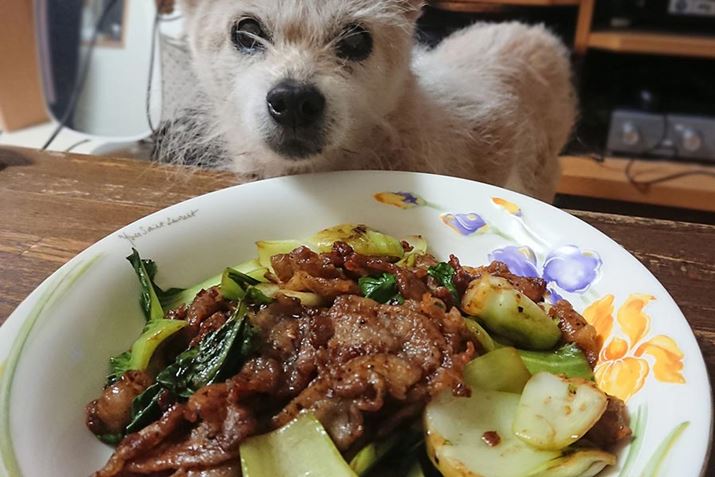 できあがった豚とチンゲンサイの肉野菜炒め。チンゲンサイの芯は中まで火が通っているのにシャキシャキ。食べ終わっても皿の下に水分が溜まっていませんでした