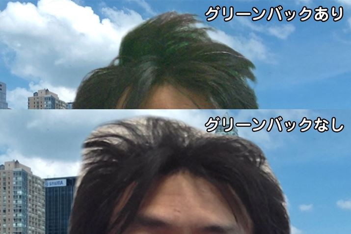比較してみると、グリーンバックを使うと、髪の毛などの細かいところまでキレイに合成されているのがわかります。