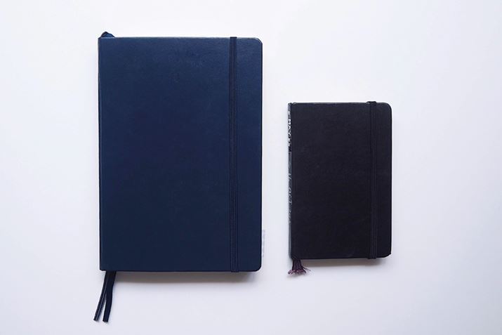 左がロイヒトトゥルム1917の「ノートブック ハードカバー ミディアム ドット」の「ネイビー」で、右がモレスキンの「クラシック ノートブック ハードカバー (無地) ブラック」の「ポケット」サイズ