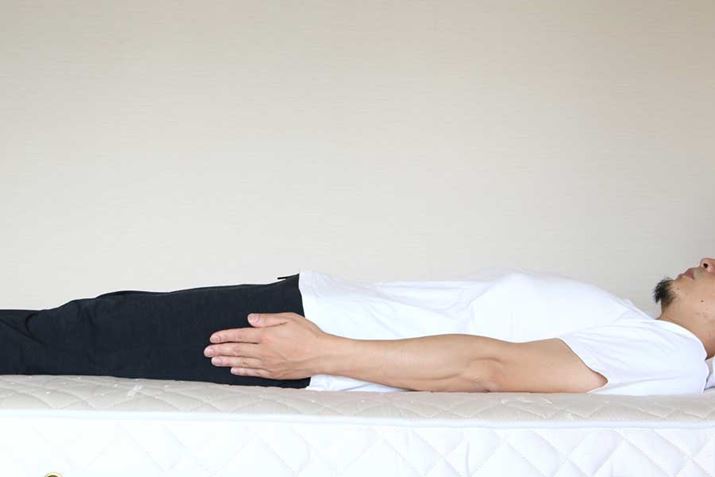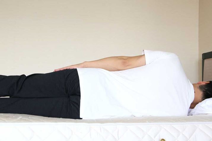 なお、仰向け寝の場合は、マットレスが体の各部をしっかりと受け止め、腰の部分とマットレスの間に隙間がないか、呼吸をしたときにお腹に力が入っていないかに注意してください。マットレスがやわらかすぎて腰が沈み込むようだと、腰痛の原因になることもあります。また、横向き寝の状態では、肩に負担がかかりすぎないことが重要です。