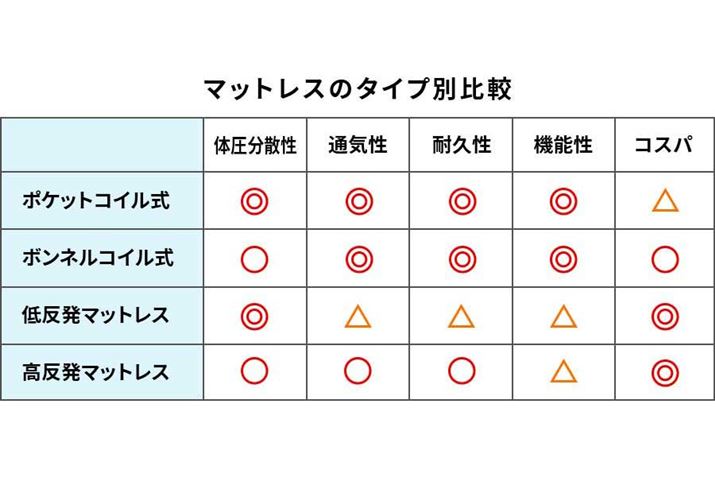 マットレスは、そのクッション素材や構造によって「コイルマットレス」と「ノンコイルマットレス」に大別できます。このうちノンコイルマットレスは「低反発」「高反発」「ファイバー」「ラテックス」などの種類に分けられます。