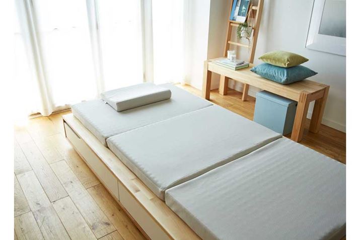 「まるでポケットコイルのようなフィット感が心地よいマットレス。高反発ウレタンフォームによくある揺れのような感じがないので、寝返りもしやすくなっています。このクオリティで価格も手頃。3つ折りなので立てかけて部屋干しができるのも魅力です」