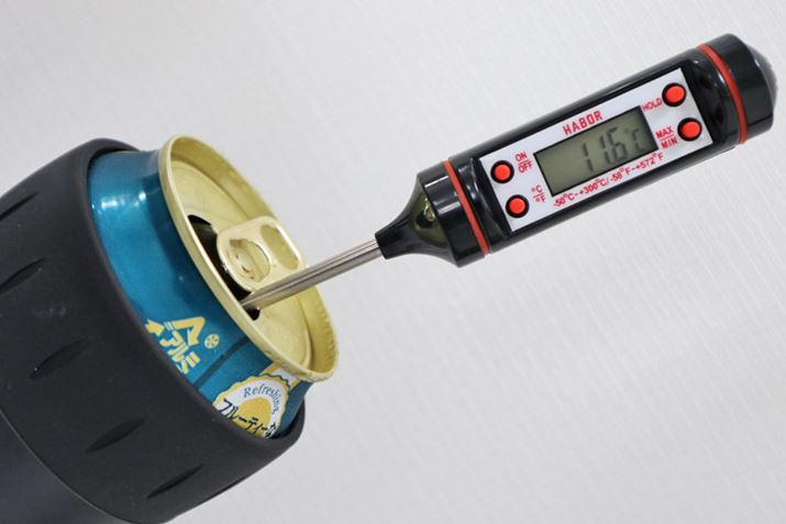 ちなみに、アイテムを使用せず缶そのままで室温に置いておくと、冷蔵庫から出した瞬間に2℃上昇し、10分後にはさらに2℃上昇、30分後にはさらに5℃も上昇してしまいました……正直そこまで差が出るとは思わず驚きです……。