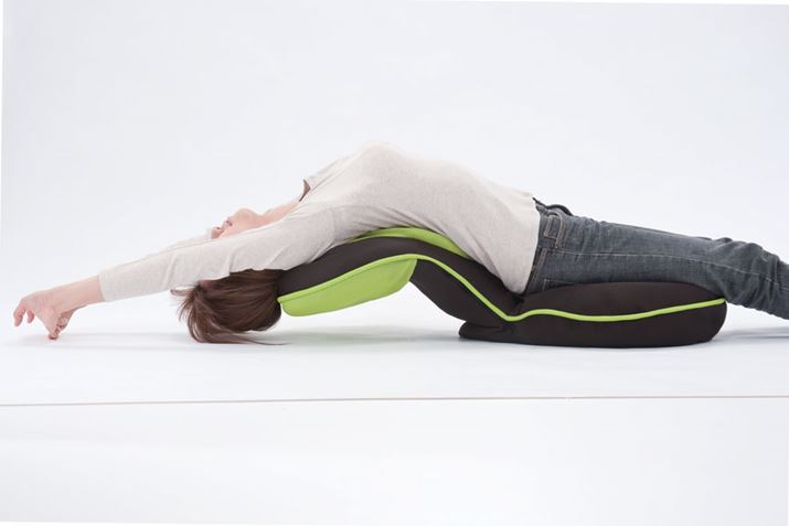 さまざまな姿勢で座れて、座ったままストレッチもできるユニークな座椅子。背中をもたれると中央のクッションが肩甲骨を広げ、背もたれを前にして抱っこスタイルで座ると、横隔膜が伸びて股関節も広げられます。フィット感が高く、背中部分の肉厚クッションが理想的なS字カーブを支え、座面中央のくぼみがお尻をホールドします。