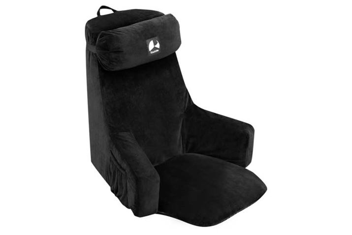 「細かい機能はないものの、さまざまな姿勢にフィットしやすくなっています。軽量で持ち運びがしやすいので、床置きはもちろん、ベッドの上に置くこともできます。アームが外側に八の字に開いた形になっているので、胡坐の姿勢でも座りやすいのがポイント。ヘッドレストが調整できるので、寄りかかって座るときに首の部分がフィットしやすいです」