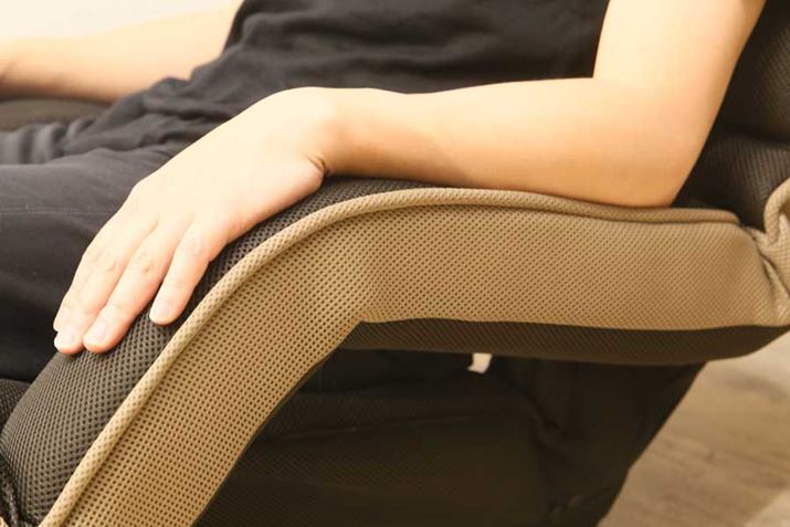 独立して腰を支える特許技術のクッション「神の手機能」を腰パーツとして採用しており、背中から腰にかけての負担を軽減できるのが特徴。また、腰に当たる部分をはじめ、後頭部、背中、ふくらはぎに当たる部分にそれぞれリクライニング機能を備えているので、自分の体や好みに合った姿勢でリラックスできます。リクライニングに合わせて肘掛けが倒れるため、座った姿勢から立ち上がるのも楽です。