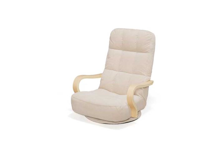 クッション性の高い、ハイバックの回転タイプの座椅子。年配の人の立ち上がりにも配慮し、強度の高い成型合板の曲木のアームを用いており、実用的な設計となっています。高級感のあるコーデュロイ生地なので、和室でも洋室でもインテリアコーディネートがしやすいです。背面にポケットもついているので、雑誌やリモコンなどの収納も可能。