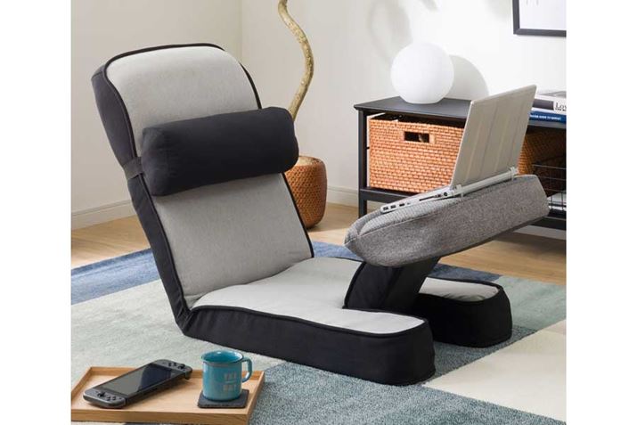 「作業テーブルがついた実用性の高い座椅子です。テーブルの角度も変えられるので、集中力が必要な作業でも、ゆったりとした作業でも使えます。取り外せるピロークッションは、枕としても腰用のクッションとしても使用可能。斬新なアイデアが光る座椅子です」