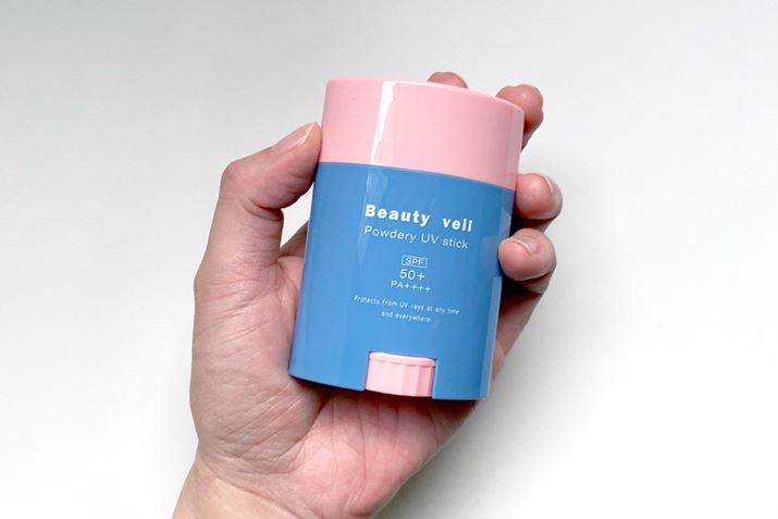 パラベン・アルコールフリーの「ビューティーヴェール パウダリーUVスティック」。パウダーインタイプで、何度塗り直してもサラサラな使い心地が特徴。頬や首筋、腕にフィットしやすいよう、ゆるやかなカーブ型の設計になっています。ピンクとブルーのパッケージもすごくかわいい!