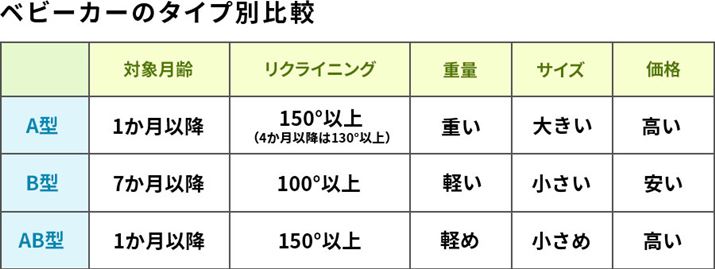 A型は月齢の低い赤ちゃんの移動も想定しているため、多機能で重量が重く、価格も高い製品が多め。これに対してB型は、リクライニングの角度が浅く、機能がシンプルな分、重量が軽く、価格は安い製品が多くなります。最近では、高機能なA型と、コンパクトで軽いB型のメリットを兼ね備えた「AB型」と呼ばれる製品が主流となっています。「AB型」は製品安全協会が定める区分ではありませんが、メーカーや店舗では一般的な呼び方として用いられています。