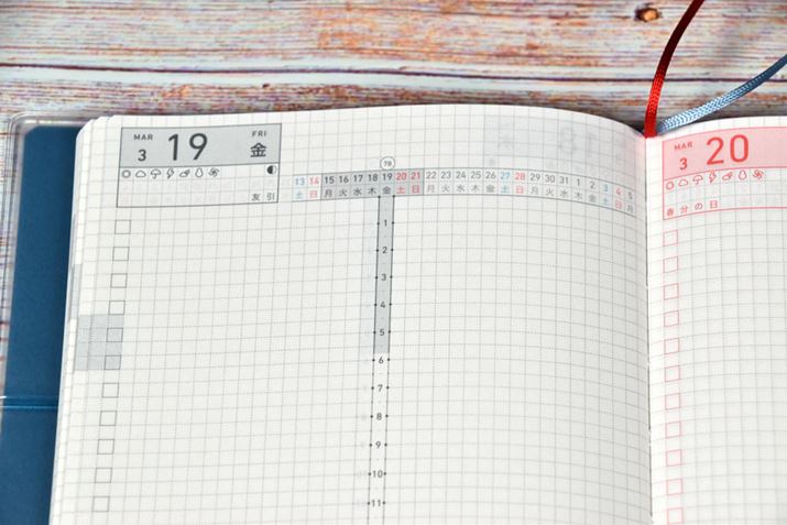1日ページの見開き。方眼ベースなので、簡単に複数の記入欄に区切って利用できる。主張しない時間軸も、いざとなれば予定管理に十分役立つ