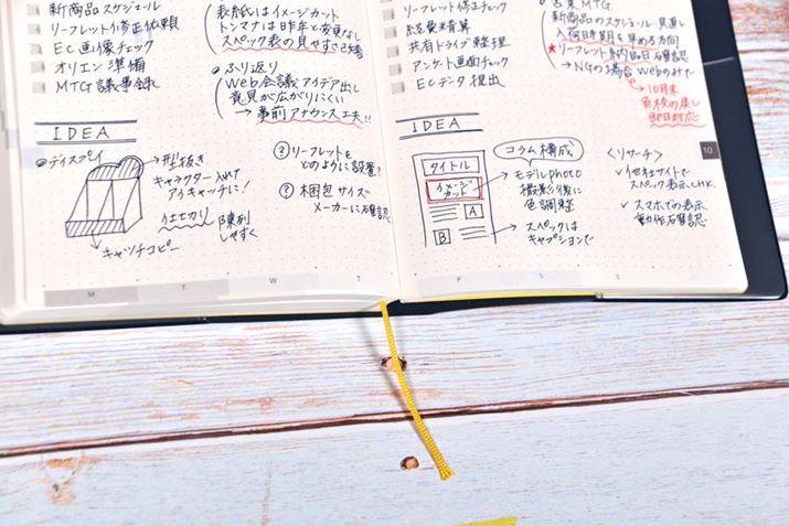まず、時間軸はページの左側に配置されており、上の写真の記入例のように予定管理に使える。記入面の上下に用意されたページを分割するためのドットによって、ページを縦に区切ることができるため、予定管理とそのためのメモの割合を自分で決められるのがうれしい。また、そもそも横罫に「ドット横罫」を採用しており、グラフやイラスト、またはライフログ的な用途にも対応可能だ。