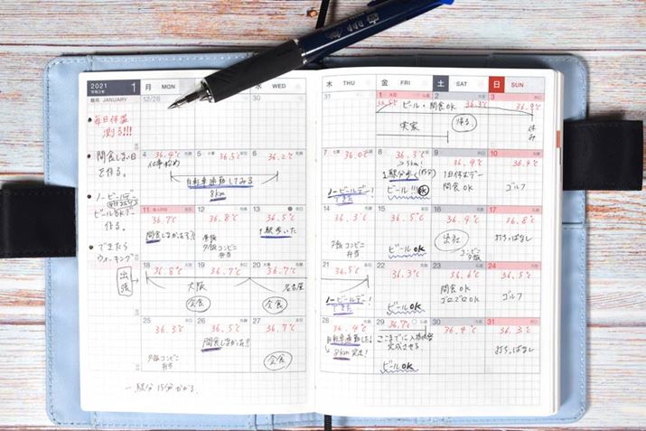 月間ページも方眼ベース。細々とした記録に向いている。この例では、毎日の体温が記録されているが、自分なりのルールを設定することで自在に使いこなせる