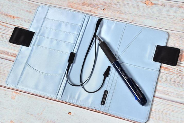 カバーの内側。カバーに「しおりひも」が付いているのが面白い。写真ではわからないが、カバーの表側にも横スリットのポケットが備わっており、メモやチケットなどを保管できる。カバーのバリエーションの多さは、単一手帳としては随一だ。なお、写真のボールペンは、「ほぼ日ストア」にて2021年版手帳本体の購入特典として予定されているもので、ほぼ日手帳20年目の記念のロゴ入り