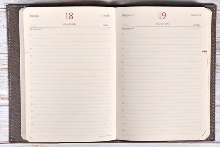 まず、見開きの面の印象はほとんど日記帳。時間軸は8〜22時の30分刻みだが、その横に伸びる罫線の印象のほうが強い。そもそもこのシックなアイボリーの紙に、シックな数字の組み合わせに対して、ガリガリと年次計画から落とし込んだ当日の目標だの、ロードマップを見すえた当日のタスクだのを書くのは、野暮というものだろう。