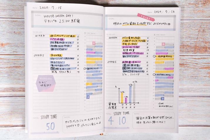 最も特徴的な「T型タイムライン」。1日を中央で縦に2分割することで、「予定/実績」「自分/家族」など、2つの項目を分けて記入できる