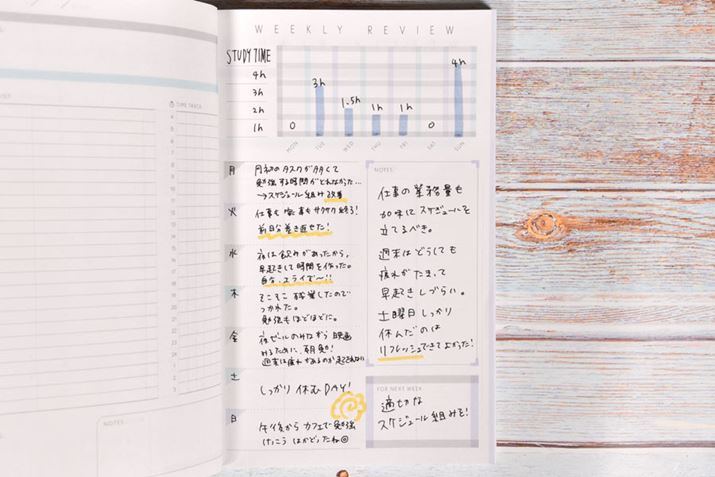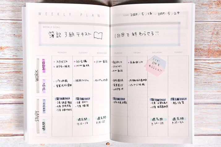 最大のメリットは、日付が入っておらず、いつからでも使い始められること。また、勉強計画用の各種フォーマットは、細かな時間管理や習慣の記録に役立つ。また1週間のページも用意されており、計画や振り返りの記録も可能だ。