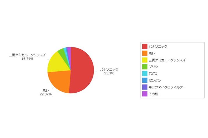 下の図表は、価格.comの「浄水器・整水器」カテゴリーにおけるメーカー別のアクセスシェアを示したものです。パナソニックや東レ、三菱ケミカル・クリンスイの注目度が高くなっていますが、そのほかにも有名なメーカーが複数あります。そこで、ここではメーカー別の特徴を解説します。