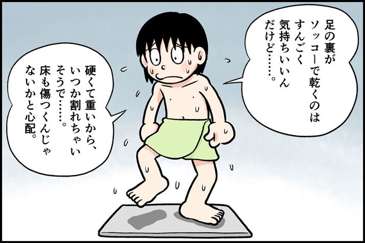 足の裏に吸い付いてくるような吸水力。一瞬でサラッと乾いてしまう速乾性。バスマットとして最高の性能なんですが、難点は重くて硬くて冷たいこと。