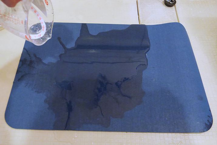 水を付けた足でそれぞれのバスマットに乗っかって、乾くまでの時間を調べたいと思います