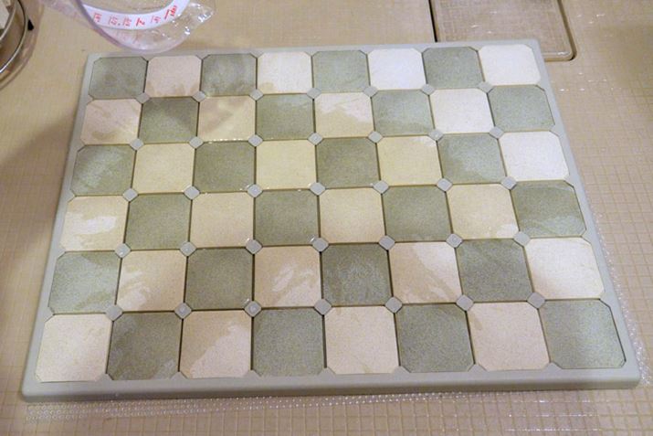 正直、重い・硬い・冷たいという弱点はそのまんま残っていますが、1枚の板じゃないため割れる心配が少なく、万一割れたとしても、タイル1枚単位で交換できるようです。