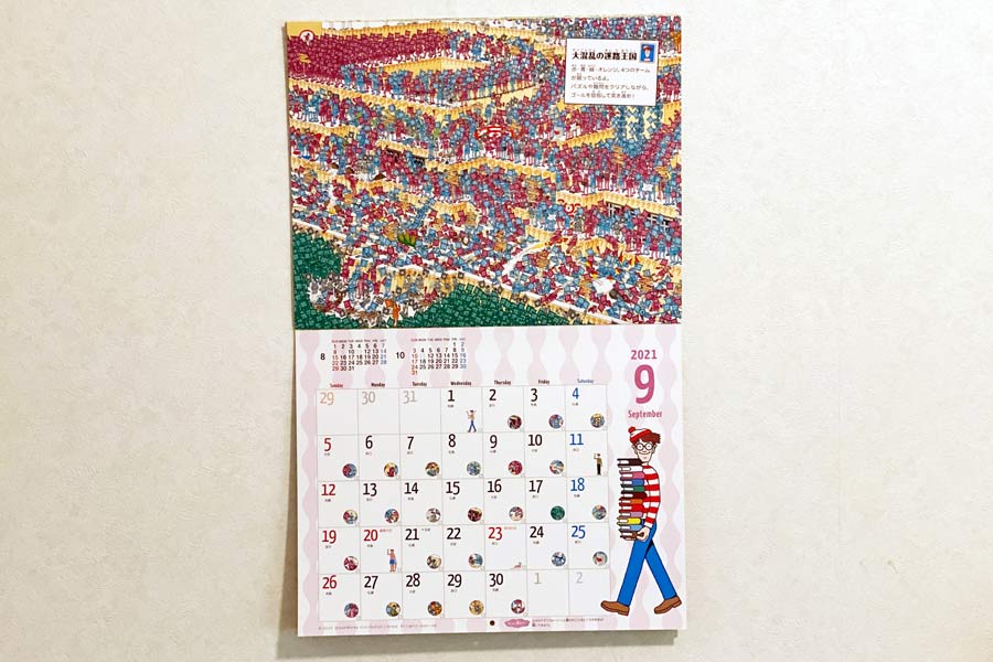 毎月、背景のどこかにウォーリーが描かれていますし、カレンダー下部にはさらに探せる項目の記載もあります