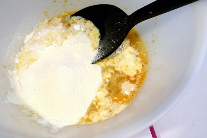 薄力粉とベーキングパウダーを入れ、ふるいながら加えます