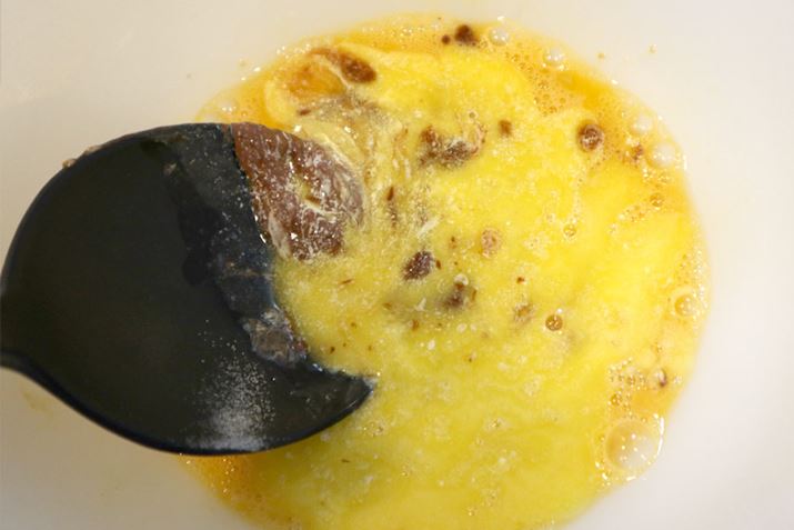 卵と牛乳を合わせて120gにしたらレンジで30秒加熱して、ドライイーストを溶かします。その後30秒ほど、レンジで温めたバターを合わせます