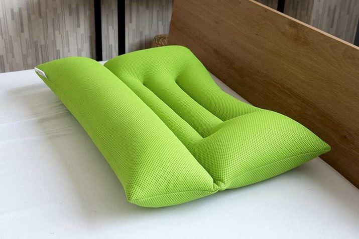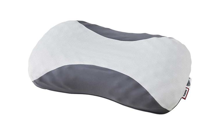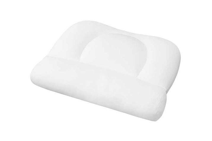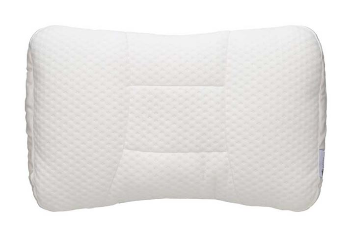 ストレートネックの人向けに開発されたという枕。一般的な枕より全体的に高さが低めで、内部は高さや大きさが異なる5つのユニットに分かれているのが特徴。両サイドが高めで横向き寝がしやすく、中央部分はやや窪んでおり、仰向け寝でも後頭部を自然に受け止めるようになっています。また、中央から両サイドに向けて首元がカーブしており、肩口にもフィットします。