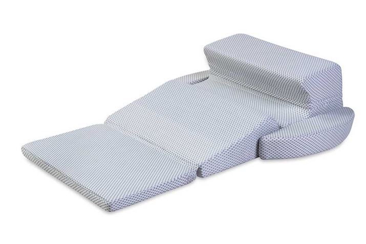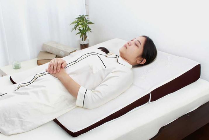 整体の先生が推奨する、傾斜で体を支える枕。上半身を少し高くして眠ることができるので、胃の中のものが逆流しにくく、逆流性食道炎の対策にもなるとのことです。頭の位置によって枕の高さも変わるため、体調によって寝る位置を変えられるのも魅力。仰向け寝が中心の人にはフィットしやすい枕になっています。