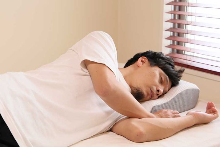 就寝時だけでなく、テレビを見る時に横になったり、三つ折りにして背もたれにしたりする使い方もできるのが特徴。適度な傾斜がついており、仰向け寝だけでなく、横向き寝の姿勢がとりやすく、首・肩・腕にかかる負担を軽減します。