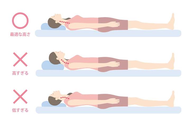 理想的な寝姿勢をとるうえでは、まず、自分に合う枕の高さを確かめるのが重要。枕の高さを自宅で確かめるには、壁に背中と後頭部を当てて、壁と首の最も窪んでいる部分の間の長さを測る方法と、バスタオルを重ねて頭の下に置いて高さを確かめる方法があります。