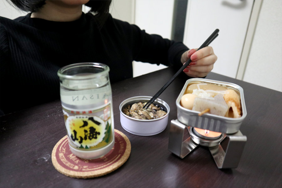 日本酒に合うおつまみといえばおでん。クロスウォーマーで温めるのであれば、このような缶入りミニサイズのものがぴったりです