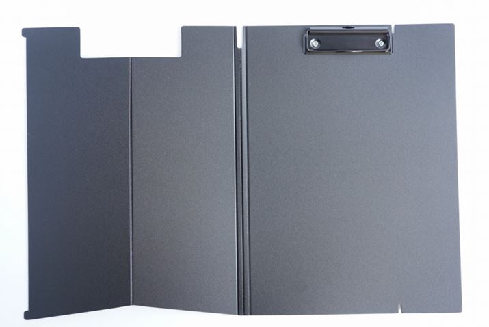 このとおり、折りたためるクリップボードです。メーカー希望小売価格(税込)は、写真のA4サイズが550円、サイズ違いの「A4サイズにおりたためるA3クリップボード+」が968円