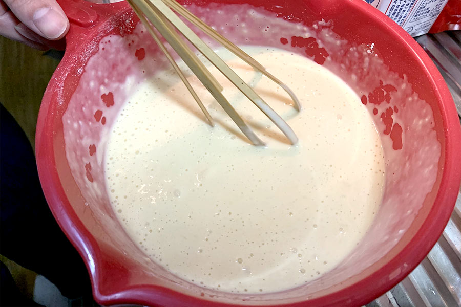 生地も手作り。我が家には計量器がないため感覚で混ぜ、それっぽい色になったらたい焼き器に流し込む。