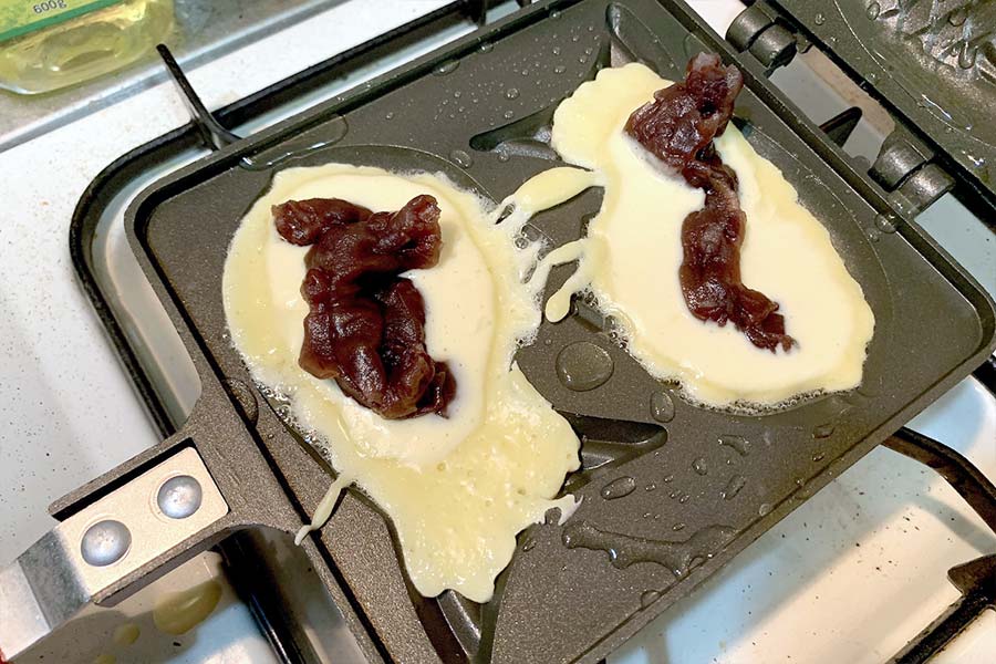 その上から生地をかけて、あんにフタをする。広がった部分は、たい焼きの「羽根」になる。いい感じだ。