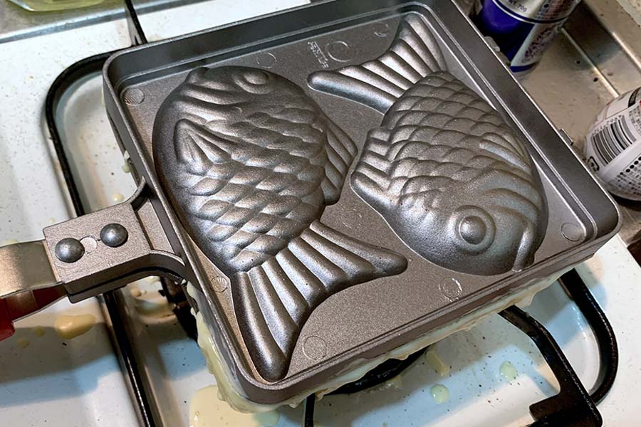 ポップなデザインのパッケージとは裏腹に、重厚感のある本格的なたい焼き器がお出まし。2匹分のたい焼きを作ることが可能だという。