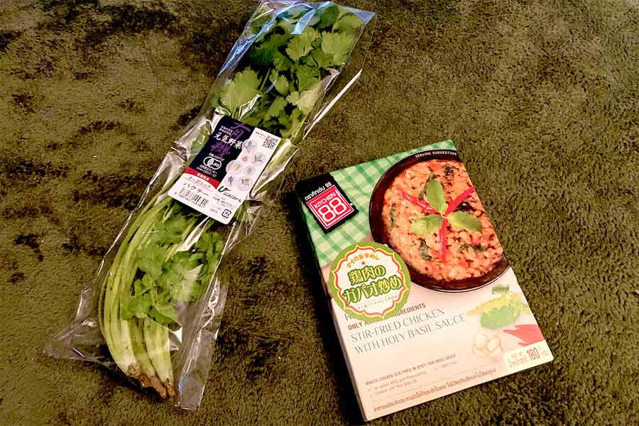 続いて、エスニック風のたい焼きを作ってみる。用意したのは、ガパオライスで使われる、ガパオ炒めとパクチー。