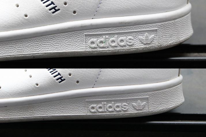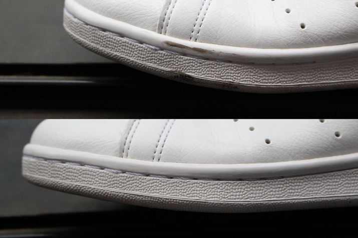 別のスニーカーもやってみました。言うまでもなく、写真向かって左側が「拭くノ助 スニーカークリーナーシート」で拭いた後、右側が拭く前です