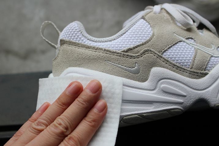 本製品はスウェード素材には使えませんが、写真のように素材が混合しているスニーカーの場合、スウェード素材以外の部分を拭くだけでもかなりキレイになります