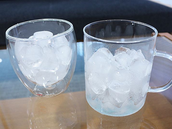 氷を入れた状態で10分ほど経った「ダブルウォールグラス」(左)と通常のグラス(右)。通常のグラスの中の氷は溶けかけて、グラスは汗をかいている。一方「ダブルウォールグラス」はまったく汗をかいておらず、中の氷もほとんど溶けていない