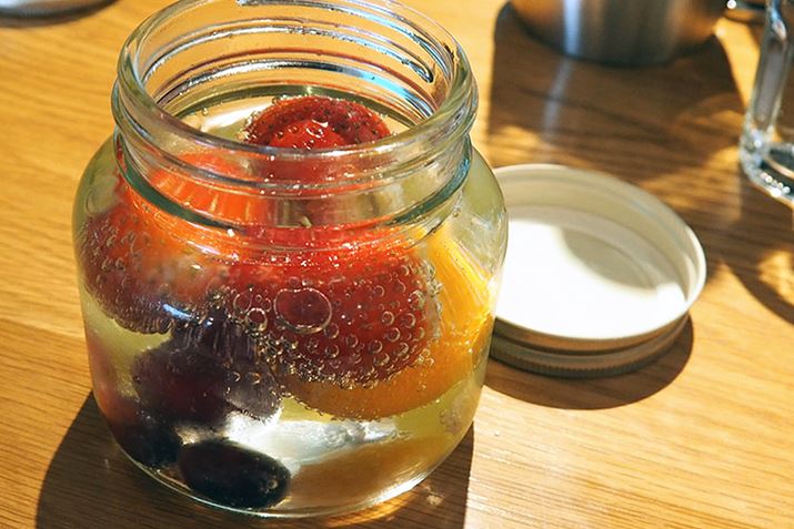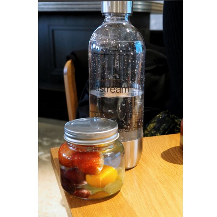 フルーツを入れた瓶にソーダストリームで作った炭酸水を注いで……調理終了! あとは冷蔵庫で6時間待つだけです