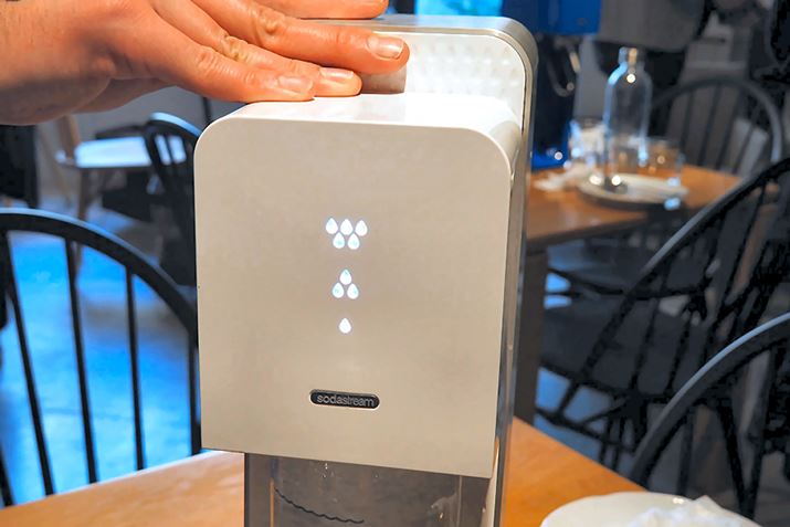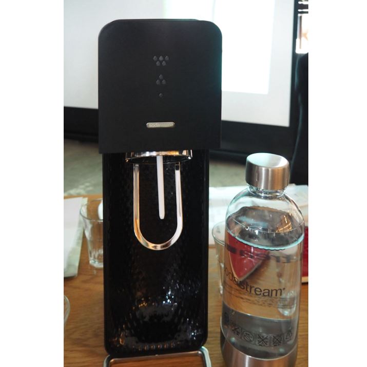 筆者の席にセットされていたソーダストリーム。ほかのテーブルには、赤などのカラフルなマシンもありました。Source Deluxeのカラーはブラック、ホワイト、ブルー、レッドの4色。コンセントを必要としないので、どこにでも設置できて便利