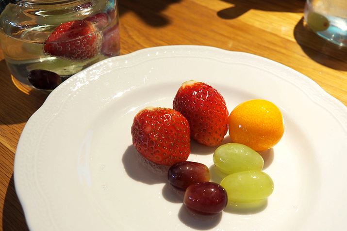 さすがに6時間も待てないため、会場では6時間炭酸に漬け込んだフルーツが配られました。今回試食できたのは、イチゴ、ブドウ、そしてキンカンの3種類。松見さんによれば、フルーツによって炭酸の溶け込む速度が異なっており、特に早く作れるのがイチゴ。イチゴなら2時間ほどで美味しいしゅわフルになるのだとか。