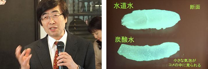 国内における炭酸研究の第一人者という前田眞治医師。炭酸水で炊いたご飯は、炊きあがりサイズが少し大きくなり、さらに、ご飯に気泡が入り込むことで、柔らかくふっくらと炊けると説明