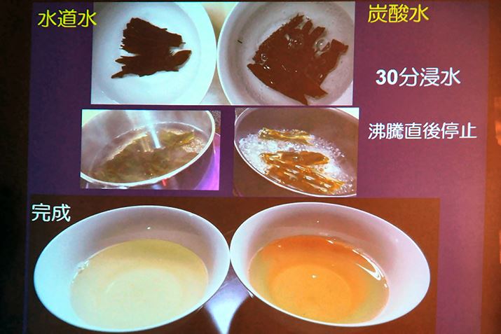 もう1つ普段の生活に取り入れられそうなのが、出汁をひく際に炭酸水を使う方法。前田医師が水道水と炭酸水で昆布を使って出汁をひいたところ、同じように処理した出汁にもかかわらず、炭酸水のほうが色が濃くできあがったのだとか。ちなみに、前田医師によると、出汁が濃くとれる理由はまだわかっていないのですが、昆布に入り込んだ炭酸が昆布の成分を押し出したか、炭酸水が微酸性であるため出汁がでやすくなったなどの仮説があるのだそうです。