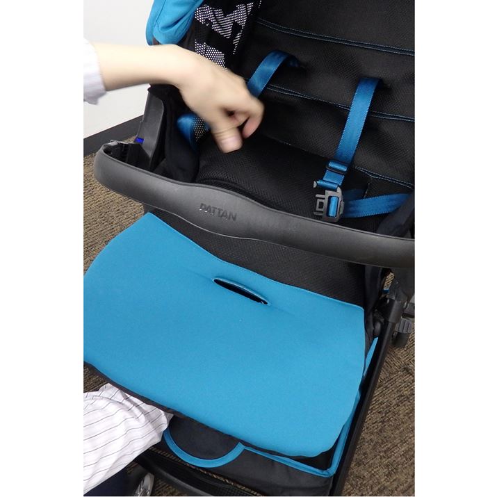 PATTANは街歩きでの使い勝手を優先した新型ベビーカーではあるものの、最新のベビーカーに不可欠な基本性能や機能もしっかりと網羅し、赤ちゃんと安全で快適に移動するためのケアが行き届いています。例えば地面からのシートの高さは53cmで、これ、赤ちゃんを乗せたり降ろしたりするのに最適なポジション。アスファルトの照り返しによる熱や、地面から舞い上がる砂ぼこりからも赤ちゃんを遠ざけてくれる高さなのです。前輪径12.5cm、後輪径14cmの車輪は、狭い道でも小回りの利くサイズ。さらに、前輪のタイヤを2輪で構成することで、段差も安定して乗り越えることができるようになっています。車輪軸にはサスペンションも備えているため、地面との接触による衝撃も緩和してくれ、赤ちゃんの乗り心地を快適にしてくれます。