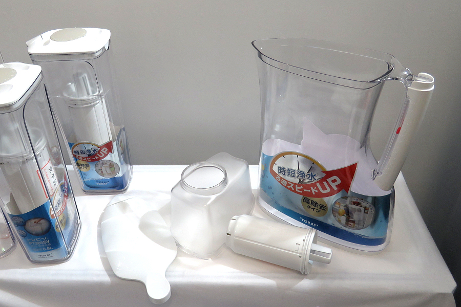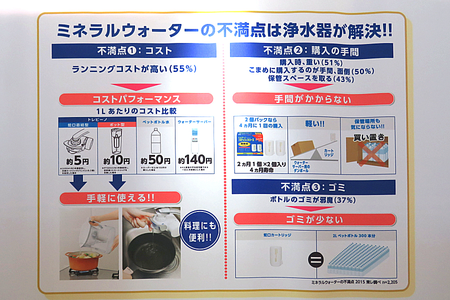 ポット型浄水器では、実機を使ったデモンストレーションで使いやすさや収納性をアピール。また、ポット型浄水器の水を飲み水としてだけでなくコーヒーやお茶、料理に使っている人が多いという同社調べの結果をうけ、“コーヒーをおいしくしてくれる水”“料理に便利な時短浄水器”としてのその魅力も強調していた。