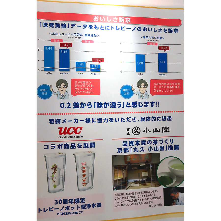 トレビーノの浄水はコーヒーや調理に活用するとおいしさが増すというアピールのため、浄水と水道水を使ったコーヒーや抹茶、出汁が試飲できるようになっていた。特にアイスコーヒーでは飲んだ後のクリア感がぜんぜん違う!