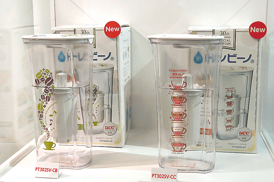 「ポット型浄水器PT302SV-CB/CC」は、“コーヒーをおいしくしてくれる水”をアピールするイラストが描かれた30周年企画限定モデル(スペシャルブレンドコーヒー粉付)。価格は3,000円(税込)